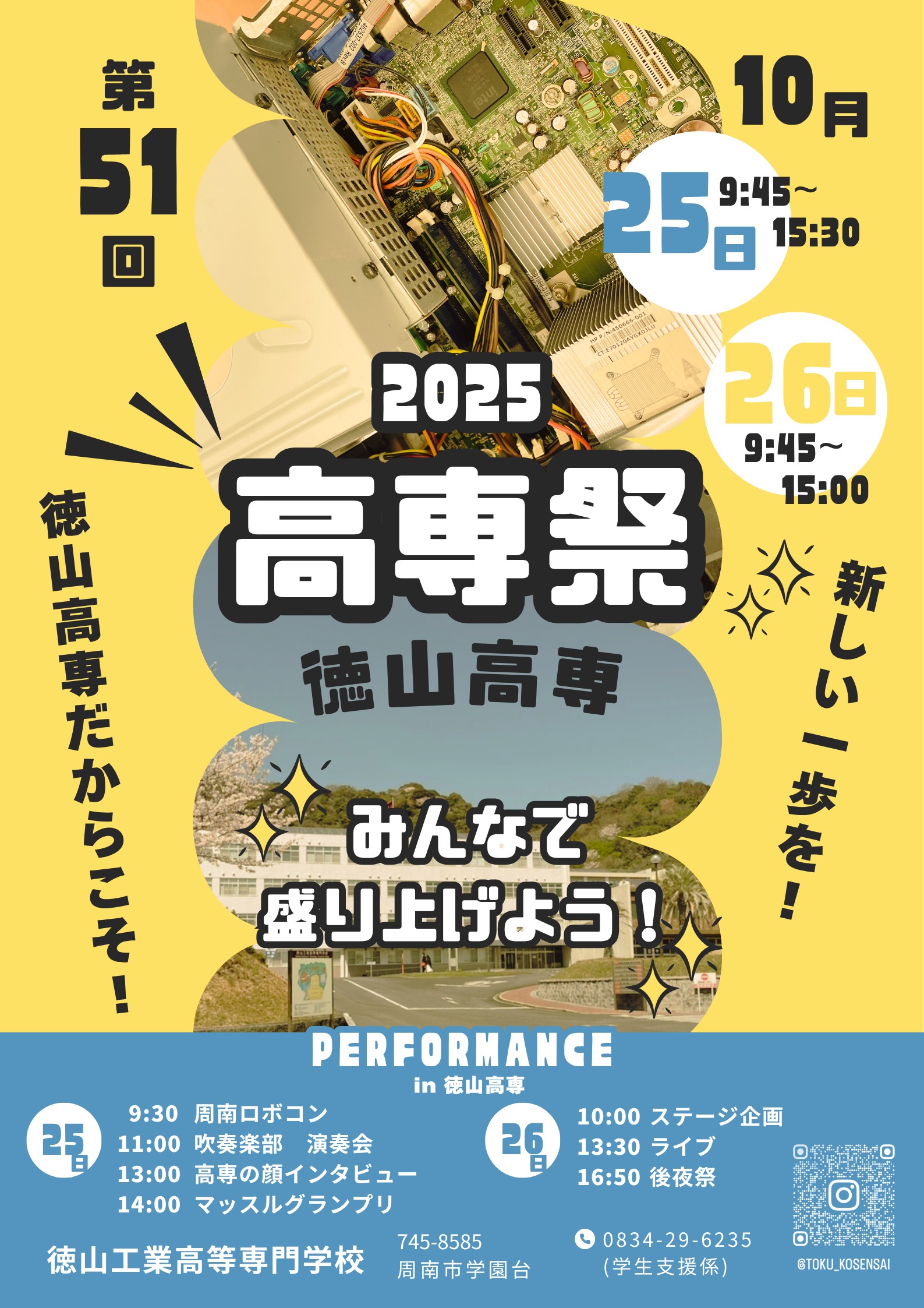 10月25日(土)・26日(日)に徳山高専第51回高専祭を開催します。今年のテーマは「Re:volution~50周年のその先へ~」です。 創立50周年の翌年であることから、徳山高専の新たな50年をつくっていく、その第一歩を踏み出すという思いが込められています。 3学科の技術を結集したメインアトラクション、2日間にわたるステージイベント、学科展示、各クラス・クラブによる模擬店などの企画を用意しています。 また、10月25日(土)には毎年恒例の好評企画「周南ロボコン2025」、同窓生どうしの交流の場となる「ホームカミングデー」も同時開催されます。 徳山高専の魅力が存分に味わえ、楽しめる内容となっていますので、皆様のご来場を心よりお待ちしています。 プログラム等の詳細は順次、高専祭実行委員会の特設サイト、X、Instagramで発信していきます。以下のリンク先よりご確認ください。 特設サイト https://nittcfes.wixsite.com/2025 各種SNS アカウント名 @toku_kosensai ● X(旧Twitter)https://x.com/toku_kosensai ● Instagram https://www.instagram.com/toku_kosensai/ ※10月26日(日)午後から、工事のため電話が不通になる時間帯があります。 令和7年10月10日 |
