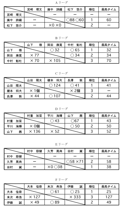 予選は3名ずつのリーグ戦で行い、上位1名の人が翌日の決勝へ進みました。また、敗者の中からタイムが早かった上位2名が同じく決勝に進みました。
