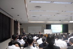 11月9日(木)、メディアホールにて、1年生に向けるキャリアプログラム、「講話② 本校顧問による講話」を実施しました。講師は勝井建設株式会社代表取締役社長勝井優様にお願いしました。国道2号線菊川大橋修繕工事に関する専門技術の話について学生たちが興味深く聞きました。