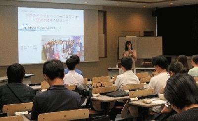 2024年6月18日に、米国ニューヨークで現役の教員・研究者として活躍されているMana Kobuchi Philipさんをお迎えして、何をきっかけに海外へ飛び出したのか?海外で博士号を取得された御経験、色々な国での言語学の研究や日本語教育を続ける大変さと乗り越え方、そして何よりも日々、ハッピーを感じるために1日1日の努力と負けないマインドをお話し頂きました。御自身のうまくいかなったエピソードも率直に話して頂いたことで、参加した学生たちからは「恐れずに行動してみる!」「強さと前向きな姿勢がやっぱり大切だと思った」といった感想を頂き、中には「日本に閉じこもらず、やりたいことをとにかくやってみます!」と改めて決意した方もいました。日本語を教えることへの情熱と共に、大変な状況や気持ちの中でもめげずに生きていくことは世界のどこでも同様に大切なマインドだと教えて頂きました。