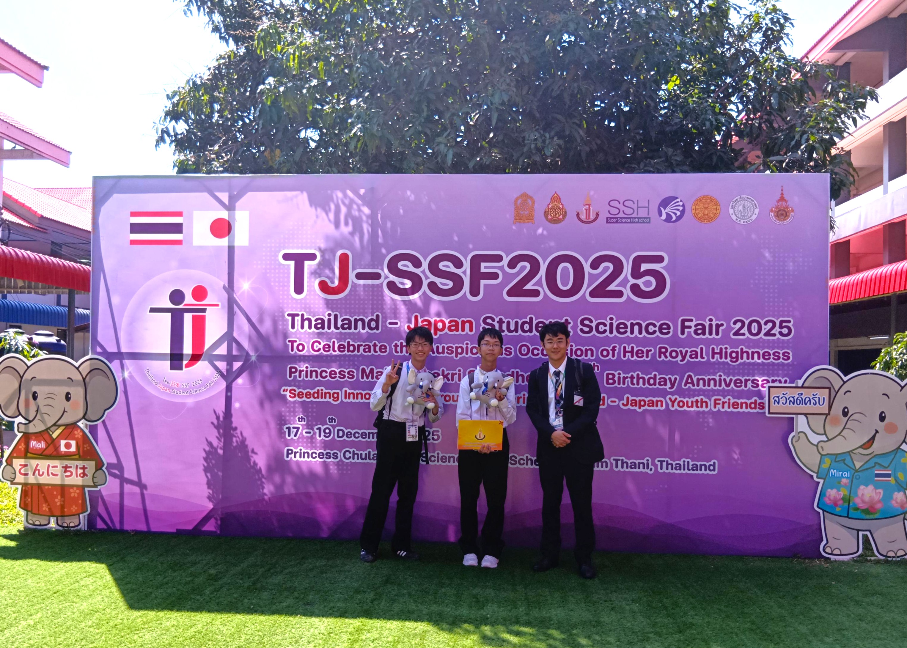 私は、タイのサイエンスフェアというイベントに参加しました。サイエンスフェアとは、タイの学校と日本の学校が研究発表をし、お互いに交流をするイベントです。私が発表した内容は数学ですが、そのほかにも化学、生物学、IT関係などの分野の発表もありました。他の発表の概要を見てみましたが、そこまで理解できず、他の学生との差を実感しました。