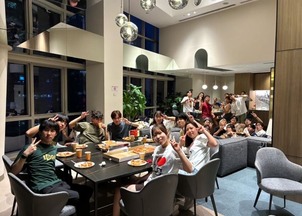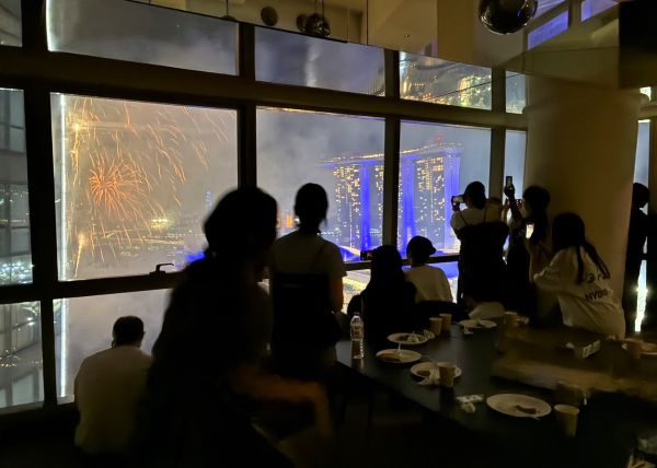 最後に、マリーナベイサンズが一望できるビルで、夕食を兼ねた送別会が行われました。風船を使ったゲームなど、さまざまなミニゲームをSPの学生の皆さんが用意してくれ、とても楽しむことができました。夕食は、SPの学生さんが流してくれた曲を聴きながら、ピザや唐揚げ、カレーパンなどを食べました。そこからは色々な建物の夜景を眺めることができ、お昼に訪れたガーデンズ・バイ・ザ・ベイもライトアップされていてとても綺麗でした。その後、マリーナベイサンズ付近で開催された花火を、全員でビルから見ました。見る位置が変わったからなのか、心境の変化によるものなのかは分かりませんが、昨日とはまた違った花火で、とても感動しました。花火が終わった後は、流れてきた曲に合わせてカラオケが行われました。シンガポールの曲や日本の曲、どちらもわかる共通の曲など、さまざまな曲が流れ、とても楽しい時間を過ごすことができました。