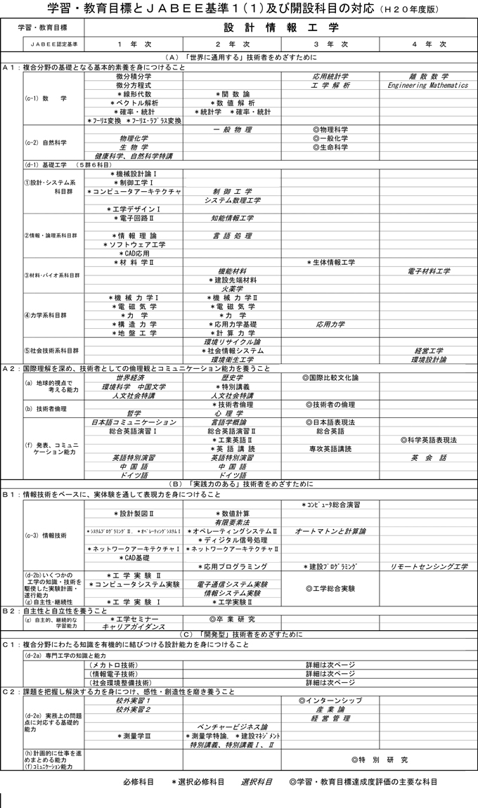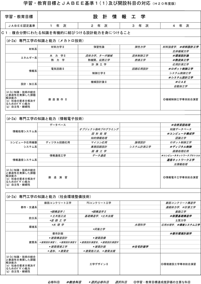 「設計情報工学」プログラム情報「設計情報工学」プログラムの構成図学習・教育目標と養成しようとする技術者像日本技術者教育認定基準(JABEE基準)学習・教育目標とJABEE基準1(1)との対応関係各学習・教育目標の達成度評価対象とその評価方法及び評価基準学習・教育目標とJABEE基準1(1)及び開設科目の対応カリキュラム系統図「設計情報工学」プログラム修了要件プログラム修了要件とJABEE基準1(1)との対応教育点検システム教員間連絡ネットワーク組織平成19年度専攻科修了生・本科卒業生・企業対象アンケート報告書平成14年度専攻科修了生・本科卒業生・企業対象アンケート報告書JABEE受審に関する6つの質問JABEEに対するこれまでの取り組みプログラム修了確認表(H21版)(Excelファイル)